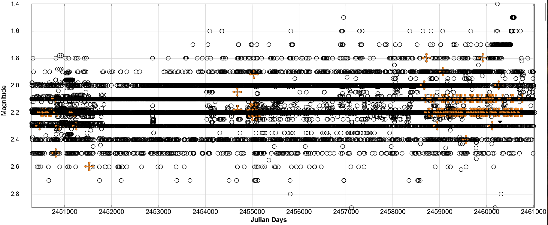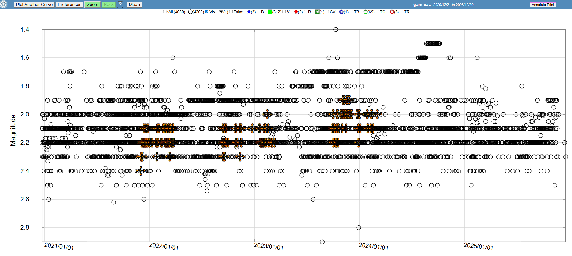 In short, what you may see in the gam Cas light curve are observations submitted by visual observers with two decimal places because they are using the Argelander method, that allows more flexibility than the Pogosn method.