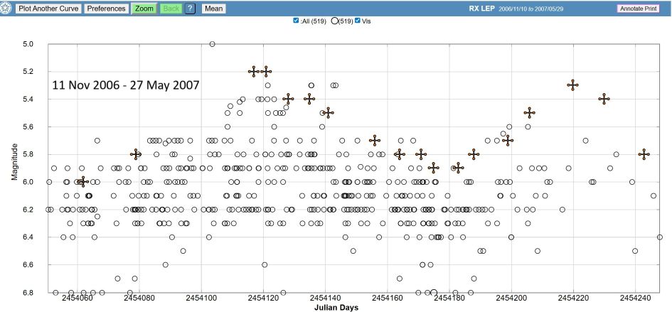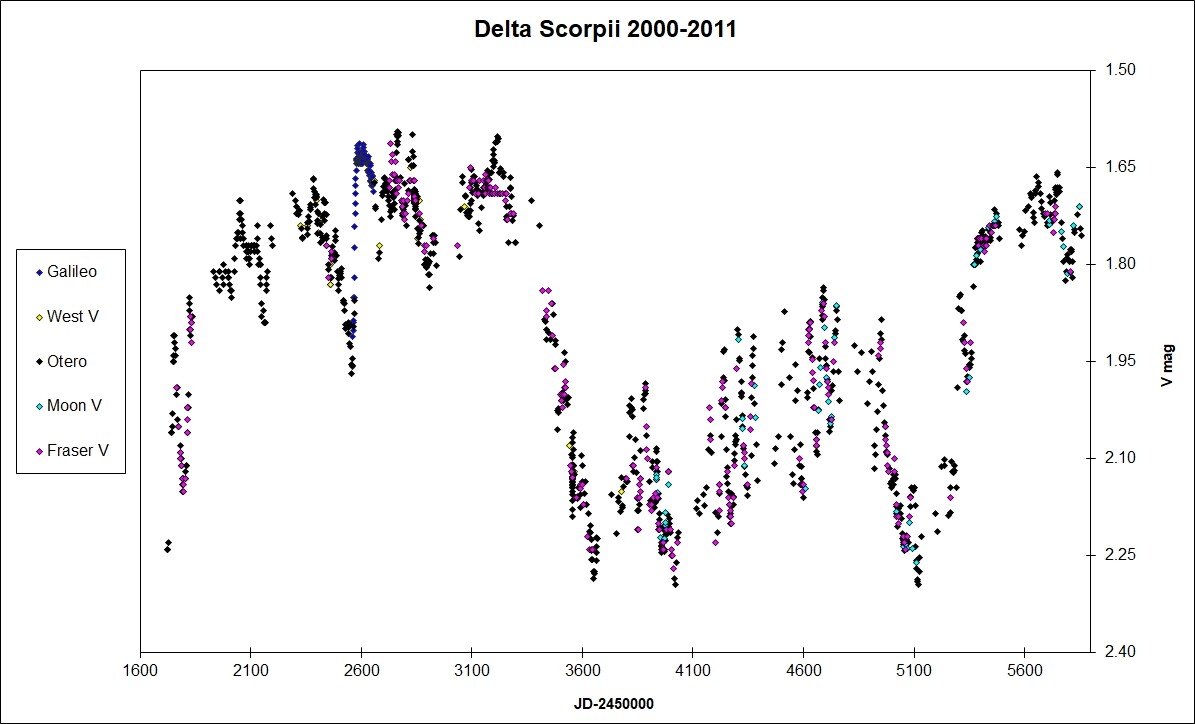 In the case of del Sco, my comparison star sequence is bet Cru (1.26v), lam Sco (1.62v), eps Sgr (1.84), the Sco (1.86), sig Sgr (2.09), eps Sco (2.29) and alf Lup (2.30v).