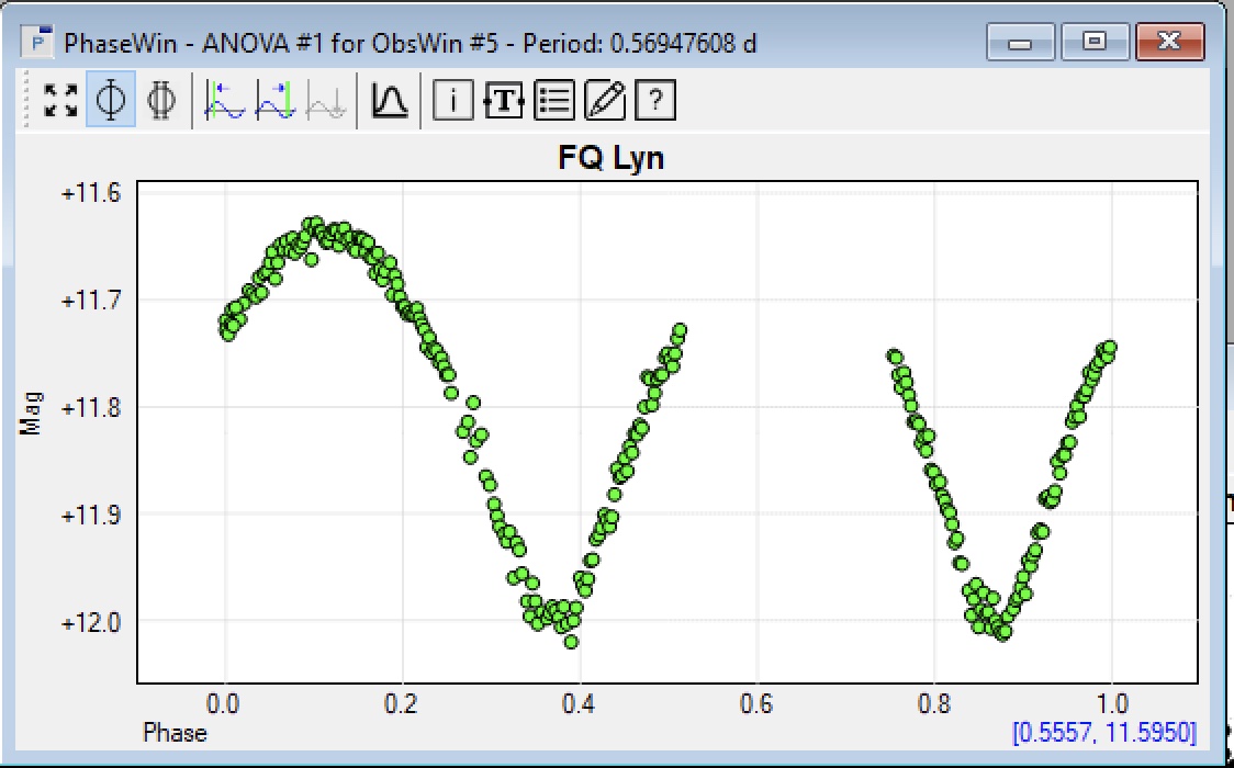A couple of days ago I was measuring FQ Lyn based upon their predicted ToM. However, even though I started an hour preceding the ToM, My light curve capture a maximum instead. It looked like the epoch they were using was not correct.