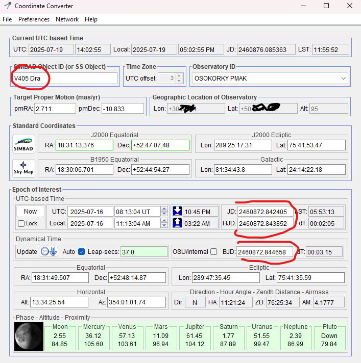 Of course, you should provide the object’s coordinates and the coordinates of your observatory (select “Custom Lon, Lat and Alt Entry” to enter them or add your observatory in the observatories.txt file in the AstroImageJ directory (and set the parameters .coords.useCustomObservatoryList=true and .dpcoords.useCustomObservatoryList=true in AIJ_Prefs.txt))