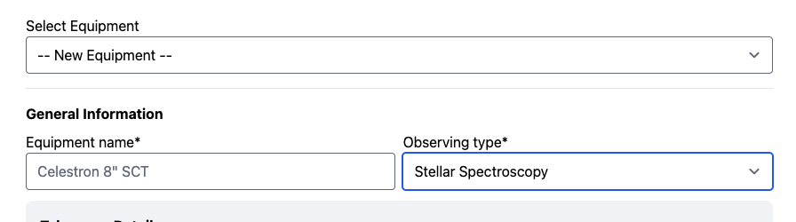 When I am on the page for uploading spectra I see my observatory but not my equipment. My equipment page is, so far as I can tell, corrected formatted, the spectrum upload page pick list is empty. What do I do about this?