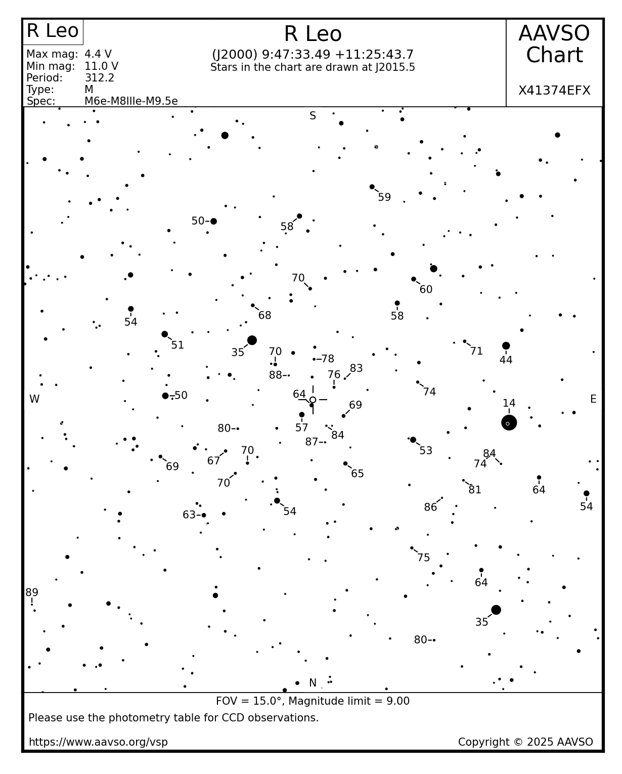 Here is a grab from today from Variable Star Plotter (VSP) of the R Leo ‘A’ scale chart. name, J2000 coordinates for telescope/planetarium program use, the chart epoch which is important for stars that may have large proper motion, Max, Min in the Johnson V filter, period is the long-term average in days, type is M (Mira-long period variable) and the spectral type.